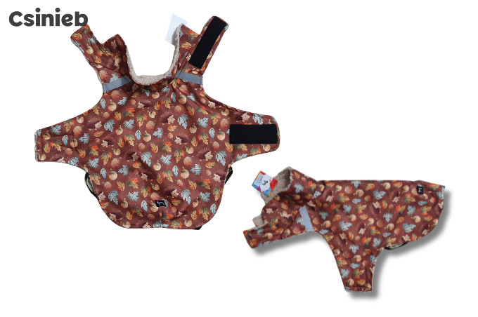 Vízlepergető külső anyag, polár bélés, tépőzáras rögzítés a nyaknál és a has alatt, így egyszerűen és gyorsan feladható, még akkor is, ha a kutya nem szereti az öltöztetést.