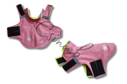 Vízlepergető külső anyag, meleg polár bélés, tépőzáras rögzítés a nyaknál és a has alatt, így egyszerűen és gyorsan feladható, még akkor is, ha a kutya nem szereti az öltöztetést.