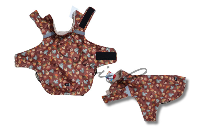 Vízlepergető külső anyag, meleg polár bélés, tépőzáras rögzítés a nyaknál és a has alatt, így egyszerűen és gyorsan feladható, még akkor is, ha a kutya nem szereti az öltöztetést.